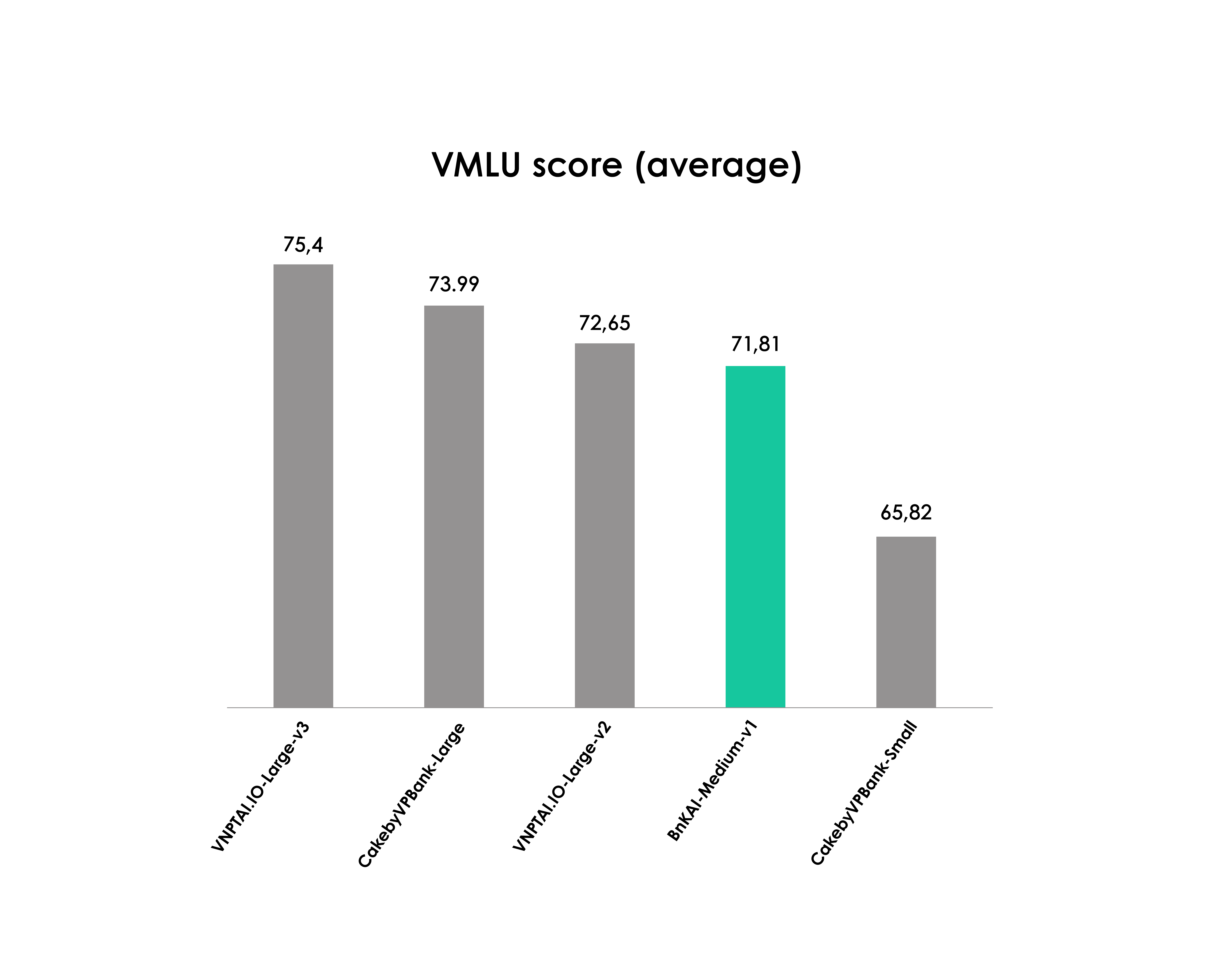 BnKAI-Medium-v1 has secured an impressive 4th place on the VMLU (Vietnamese Multitask Language Understanding) leaderboard which is a significant achievement given the company's product development strategy. The top three models: VNPTAI.IO-Large-v3, CakebyVPBank-Large, and VNPTAI.IO-Large-v2 are all large models that require significant hardware resources to operate. In contrast, BnK Solution has strategically developed a medium-sized model that strikes a balance between language processing performance and practical deployment capabilities within a typical business setting.