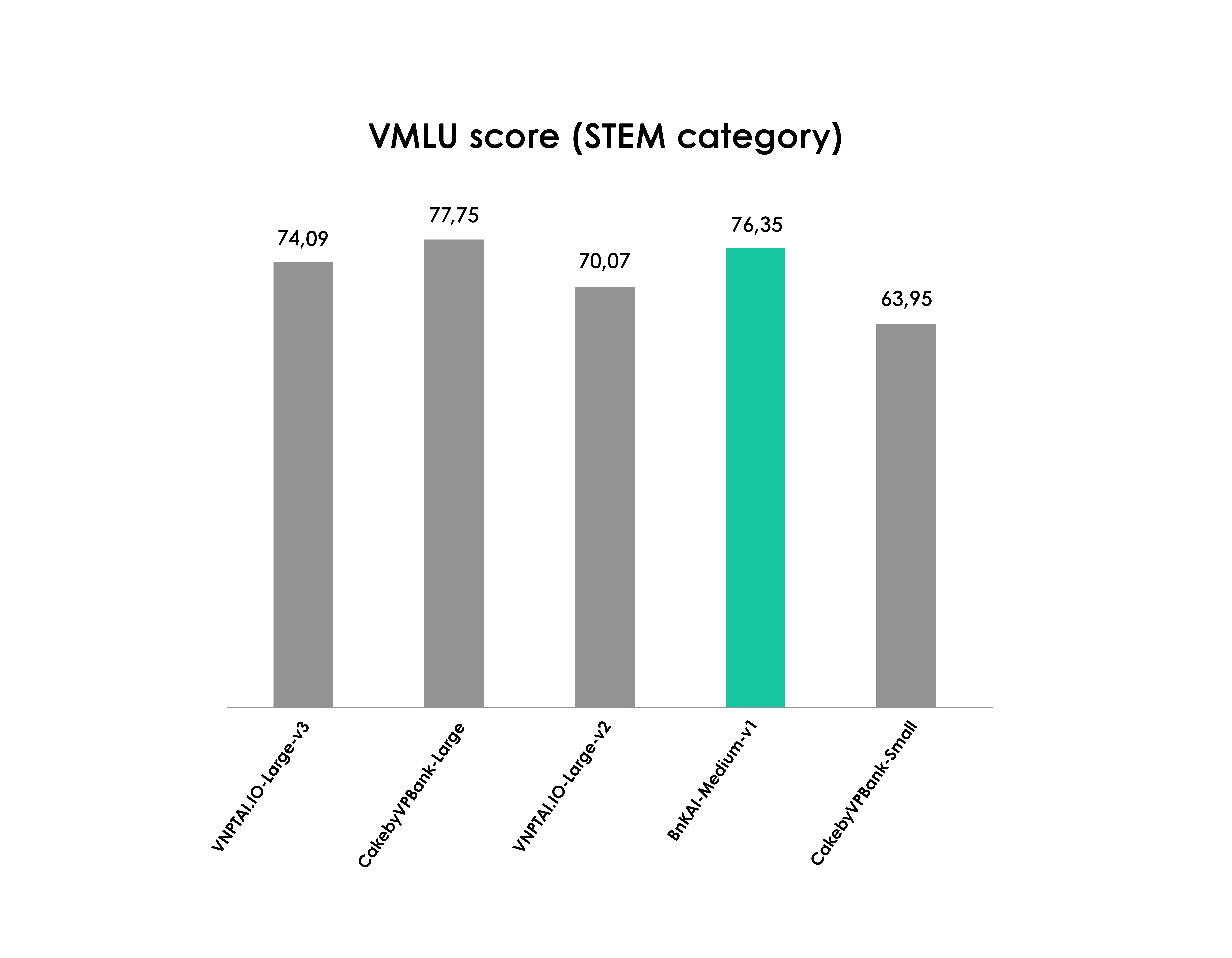 With an impressive average score of 71.81, and particularly strong performance in STEM (76.35) and Social Sciences (75.58), BnKAI-Medium-v1 demonstrates its ability to handle a wide range of specialized fields. The VMLU is a comprehensive evaluation standard developed by the Japan Advanced Institute of Science and Technology (JAIST) and Zalo AI, comprising nearly 11,000 questions across 58 different topics.