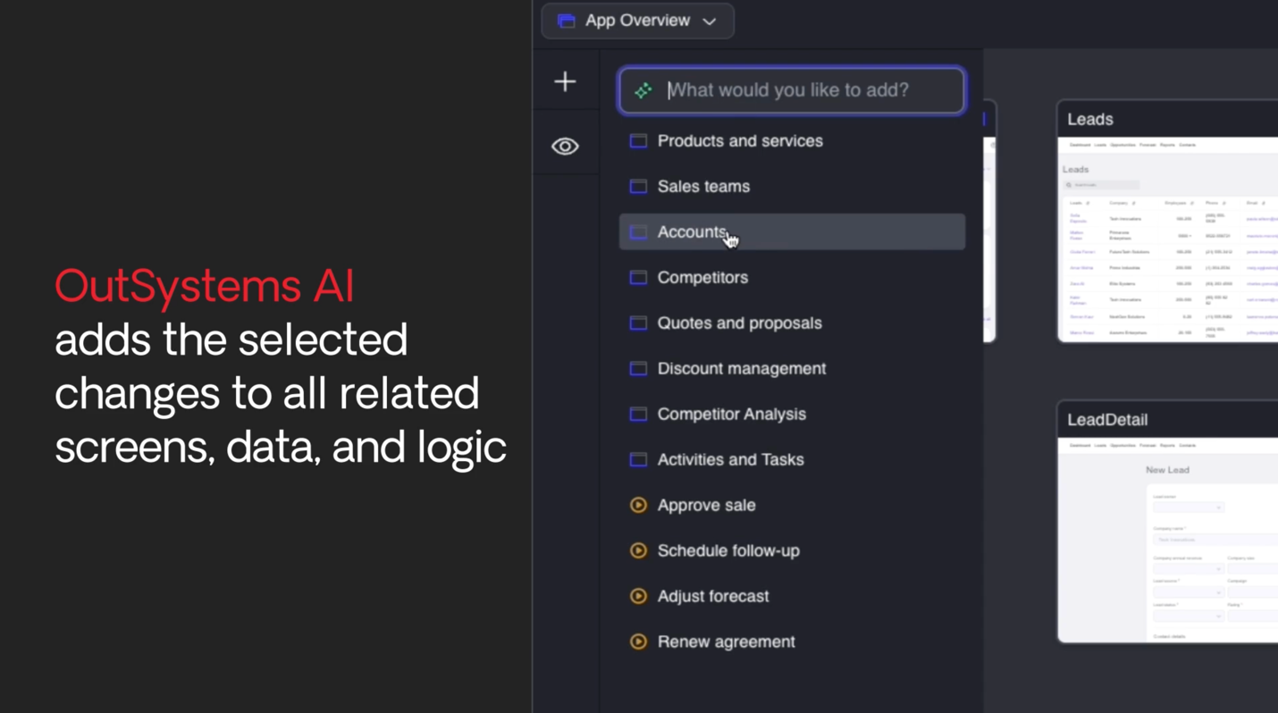 OutSystems cũng cung cấp một trình biên tập ứng dụng được hỗ trợ bởi trí tuệ nhân tạo, cho phép nhận được các gợi ý liên tục. Để hoàn thiện mô hình Generative AI phức tạp, OutSystems sử dụng hệ sinh thái hiện có của các ứng dụng để điều chỉnh. Kết quả là, người dùng sẽ nhận được gợi ý toàn diện từ dữ liệu đến giao diện người dùng, giúp thay đổi ứng dụng một cách dễ dàng và không gây lỗi.